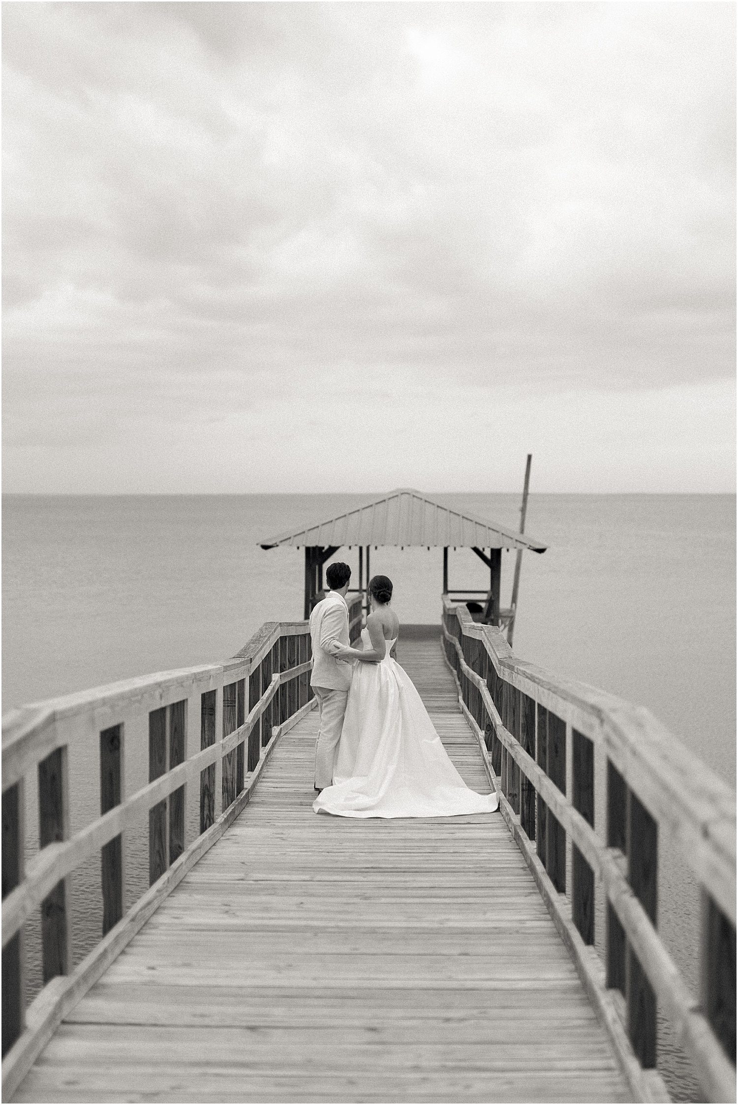 For portraits, we wandered down to the water, using the quiet beauty of the Gulf Coast and the dock as a natural canvas. The breeze was gentle, the light was perfect, and in one of those serendipitous moments you can’t plan for, a butterfly appeared and fluttered around. Later, during toasts, guests erupted into cheers, filling the courtyard with laughter and love.